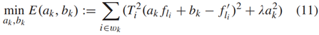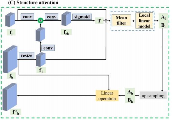 위와 같은 식을 이용해서 fli와 f’li가 유사해지도록 하는 Ti와 ak,bk를 구한 후 upsample 하면 Ah와 Bh를 얻을 수 있습니다. 그런 다음 아래 식과 같이 최종 high resolution feature를 보완한 f’h를 얻을 수 있습니다 이 feature를 conv와 sigmoid를 통해서 최종 disp를 얻게 됩니다.