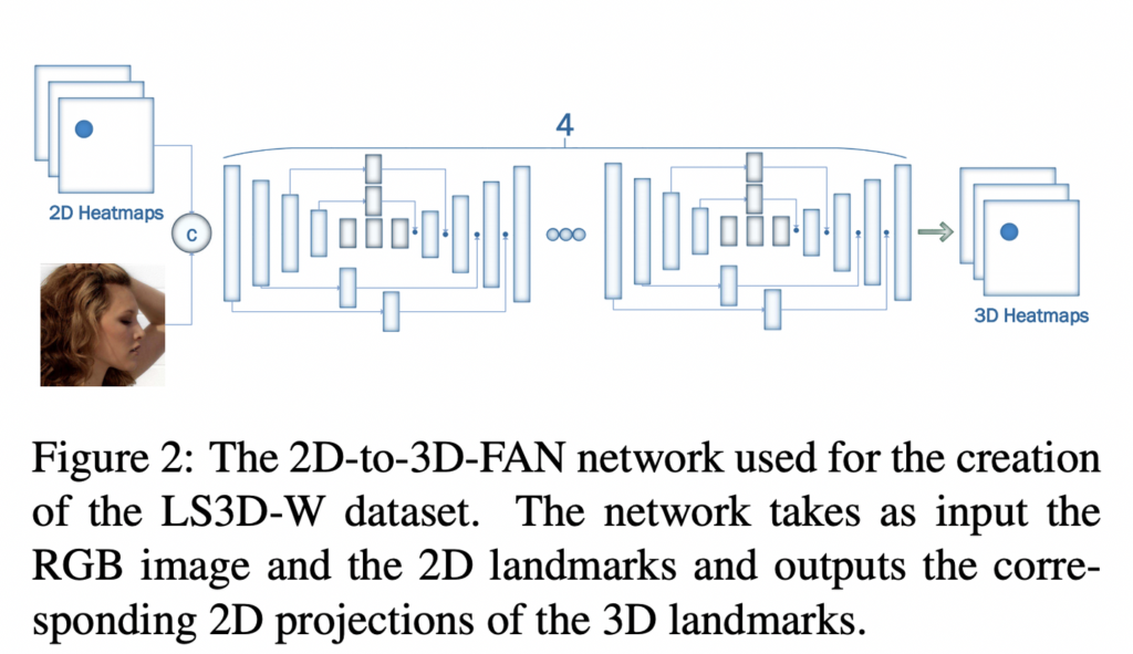 이 논문의 contribution 중 하나는 바로 초대형 3D 데이터셋 LS3D-W 구축입니다. 부족한 3D face landmark 데이터셋 구축을 위해 2D 랜드마크에서 3D 를 예측하는 네트워크를 제안하였는데요 그것이 바로 “2D-to-3D-FAN” 입니다. 2D 이미지의 랜드마크가 주어지면 해당 네트워크는 2D 랜드마크를 3d 로 변환합니다. 이 네트워크를 학습하기 위해 동일한 이미지에 대한 2D, 3D GT가 있는 300W-LP를 사용합니다.