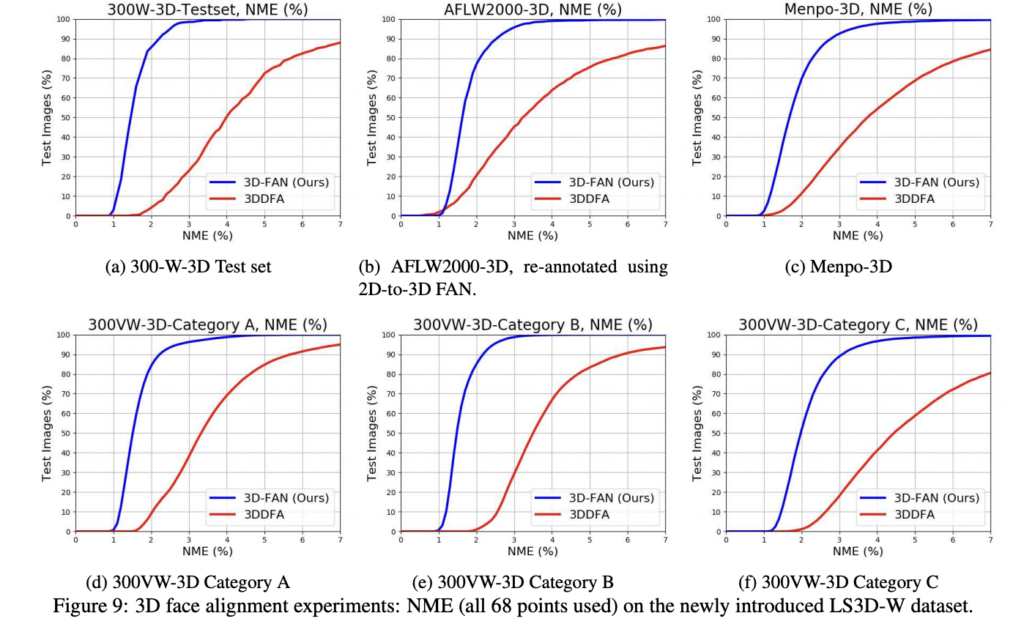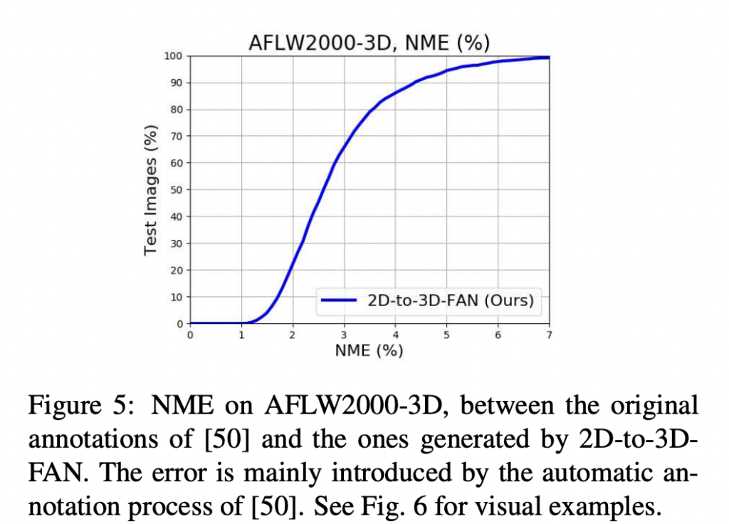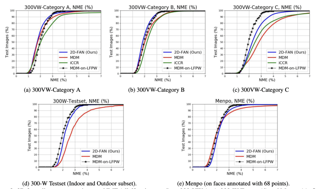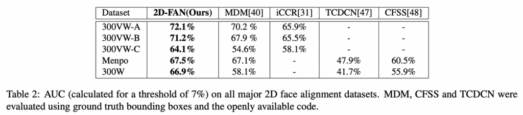 300-W-LP2D 데이터셋으로 학습한 2D-FAN을 300-W test set, 300-VW 그리고 Menpo (frontal subset)으로 평가하며 총 평가 데이터의 개수는 대략 22만개 이상입니다.