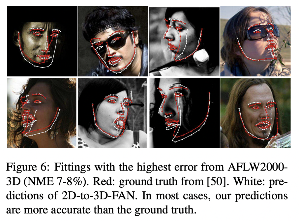 앞서 2D-to-3D-FAN을 통한 대규모 데이터셋을 구축했다고 언급하였습니다. 그러나 2D-to-3D 평가는 pair 한 GT 가 부재하기 때문에 어렵습니다. 그나마 wild 한 데이터셋에서 사용가능한 3D 랜드마크 GT는 AFLW2000-3D 뿐입니다. 따라서 데이터셋 AFLW2000-3D에 2D-to-3D-FAN을 태운 뒤, 아래 그림 5에 나타난 오류를 계산하였다고 합니다. (이 때, normalization을 위해 bbox가 사용됩니다) 그 결과, 몇 개의 이미지에 대한 불 일치가 있었지만 그 불일치 역시 GT가 잘못된 것이었다고 합니다. 아래 그림 6이 바로 불일치가 높은 (에러가 높은/GT가 잘못된) 이미지들을 나타낸 것입니다
