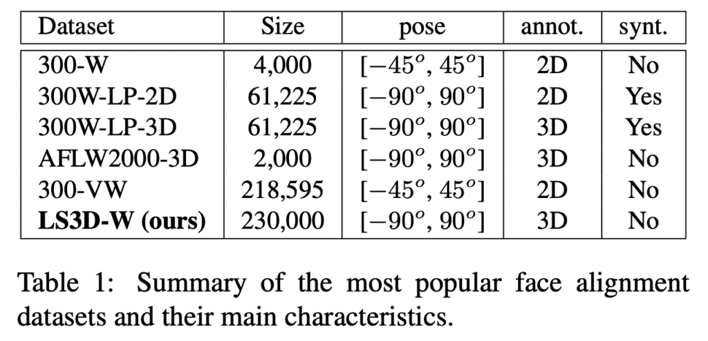따라서 300-W의 테스트셋, 300-VW, 그리고 Menpo에 대한 2D-to-3D-FAN으로 발생한 3D 랜드마크와 AFLW2000-3D를 포함하여 총 23만 개의 이미지에 3D 랜드마크 GT가 있는 논문이 쓰여진 당시까지 가장 큰 3D face in the wild datasetLS3D-W)을 만들 수 있습니다.