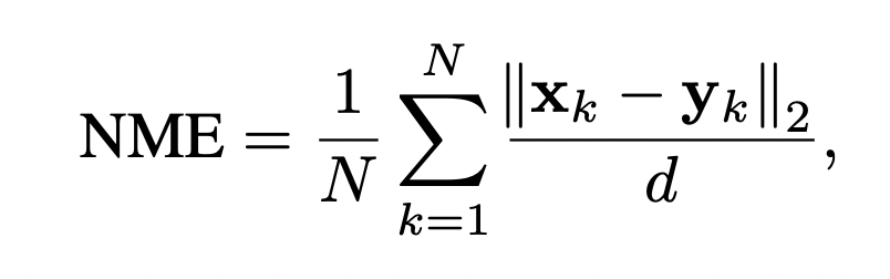 기존에 face alignment 에 사용되던 지표는 정규화된 랜드마크에 대한 point-to-point 유클리드 거리였습니다. 그러나 이 평가 메트릭은 눈 사이 거리가 매우 작을 수 있는 측면 얼굴에는 적합하지 않기에, 다음과 같은 NME를 사용.