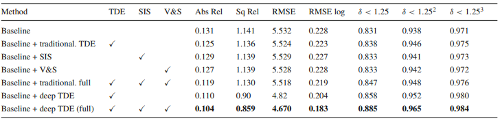 Ablation study인데, 일단 base line을 너무 낮게 잡은게 아닌가 싶다. Monodepth2가 일단 Abs_rel이 0.115가 나오는 상황인데 0.131이 베이스라니.. 크흠…