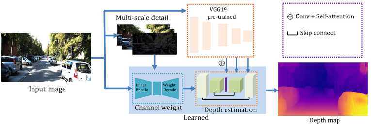 다음은 vgg19를 이용한 semantic information 추가 이다. 학습을 용이하게 하고 깊이 추정의 기하학적 왜곡을 완화하기 위해 이 방법을 추가했다고 한다. 방법은 그림 1 과 같이 영상을 VGG19에 태운후 그 정보를 기존 Depth estimation model에 추가하는 것이다. 단순히 feature를 더하지는 않고 feature를 conv를 태운 후self-attention 모델에 태운후 decoder feature와 합친다.