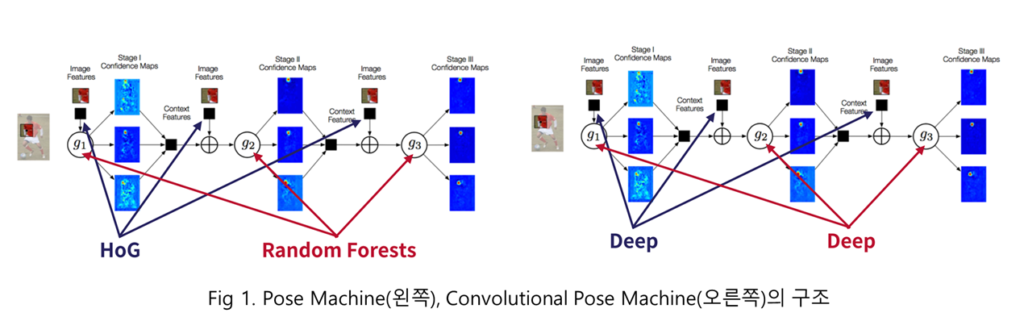 이전 방법론들(2016년 기준)은 대부분 그래프를 이용하여 사람의 자세를 추정하였습니다. 그래프를 이용한 방법론들은 키포인트를 추정함에 있어서 전문가들이 사전에 정의한 정보들을 이용합니다. 그에 따라 신체 일부(관절 일부)가 보이지 않는 경우, 제대로된 키포인트 추론이 어려운 문제가 있습니다. 저자는 이러한 문제를 해결하기 위해 키포인트의 추론 부분부터 학습하는 방법을 제안합니다. 이번에 리뷰할 Convolutional pose machines(CPM)의 전신인 Pose Machines에서 전통적인 기법(HoG, Random Forests)를 이용하여 local에서 global하게 인지 구역을 넓히면서 다른 부위와의 관계를 고려한 방법을 처음 제안함으로써, 키포인트를 학습을 하여 추론할 수 있게 됩니다. CPM은 전통적인 기법들을 CNN으로 변경한 방법론이라고 보시면 됩니다.