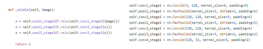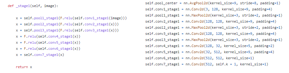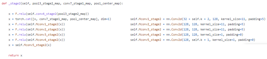 스테이지 t>1 에서부터는 예측자가 대체된 CNN으로만 구성됩니다. 또한 이전에 예측된 confidecne map에 해당하는 conv_stage1_map을 concat 하는 것을 볼 수 있습니다. pool3_stage_map은 t>1 부터 사용되는 공통된 특징 연산자에 해당합니다.