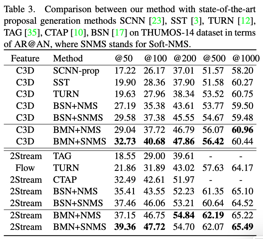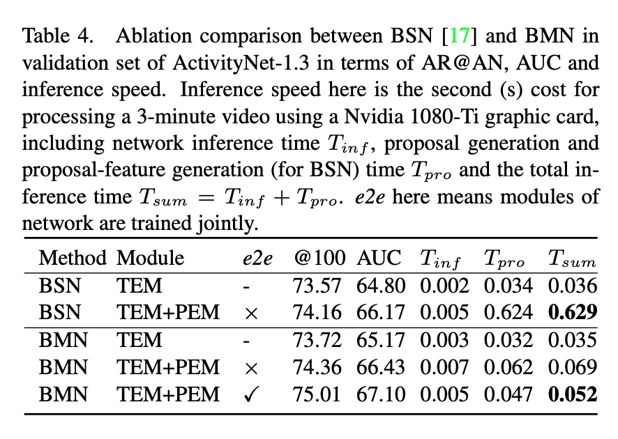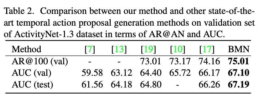 마지막으로는 e2e 방식 즉 , TEM과 PEM을 따로따로 학습 시킨 것이 아닌 , jointly하게 학습 시켰을 때 가장 좋은 성능을 보여주며 이는 BMN의 framework의 optimization이 전반적으로 잘 수행이 된다는 것을 의미합니다.