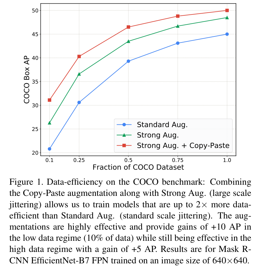 해당 방법은 Fig 1과 같이 데이터 수(x 축)에 상관 없이 대략 +10 Box AP 정도의 성능 개선이 이뤄진 것을 볼 수 있습니다. 이 실험 결과를 토대로 해당 방법론이 데이터 셋에 대한 효율성을 향상 시켜준다는 것을 증명합니다. 또한 영상 크기, 모델의 변경 실험에서도 성능 향상을 보이며, SOTA 방법론에서도 성능 개선을 가져왔습니다. (해당 논문을 알고 있는 이유도 Paper with Code에 해당 방법론을 이름으로 한 팀이 1등을 꽤나 오래 유지하고 있었습니다.)