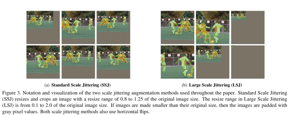 저자는 scale에 대한 강인성을 주기 위해 Scale Jitter를 적용합니다. 어떤 값을 이용하는 것이 좋은지 보이기 위해 이전 연구에서 흔히 사용되는 영상 비율을 0.8-1.25 변화하는 Standard Scale Jittering(SSJ)과 제안하는 0.1-2.0의 변화를 주는 Large Scale Jittering을 소개합니다. 성능면에서 LSJ라 더 좋다는 것을 실험적 결과로 보입니다.