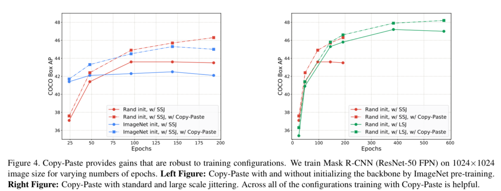 이전 연구에서 COCO에서 학습 기간이 길어질수록 성능이 향상된다는 연구 결과가 있었다. Fig 4에서 보이는 바와 같이 같은 epoch 동일한 성능으로 시작했지만 epoch이 지날수록 제안한 기법이 적용되지 않은 모델보다 성능이 향상되는 것을 볼 수 있다. 이를 통해 학습 기간에 영향이 덜하도록 만드는 매우 실용적인 데이터 증강 기법이라는 것을 증명한다고 주장한다.