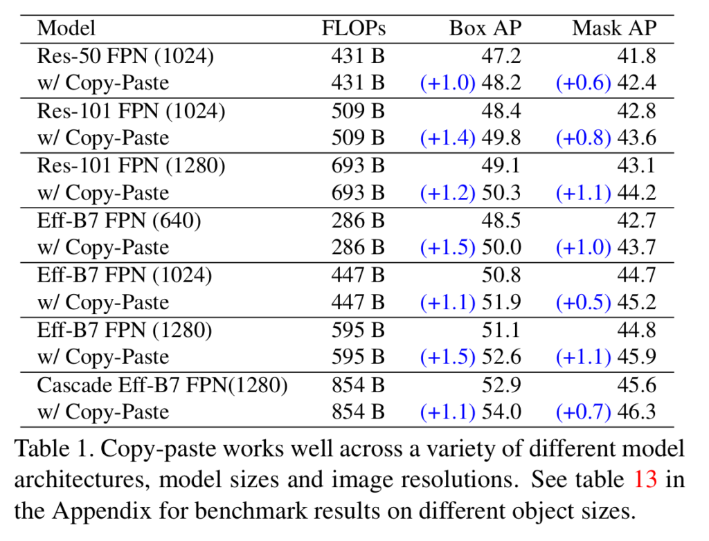 Copy-Paste works across backbone architectures and image sizes