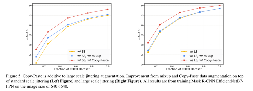 저자가 제안하는 Simple CopyPaste는 붙여 넣을 때, 랜덤한 위치에 붙여 넣으며 또한 scale에 강인성을 데이터에 부여하기 위해 소스 영상의 크기를 조절하는 Large Scale Jitter(LSJ)라는 방법을 추가합니다.(Fig 2의 영상 크기 다른 이유가 LSJ 때문입니다. 걍 resize crop 한거 라고 보시면 편합니다. + random horizontal flip)