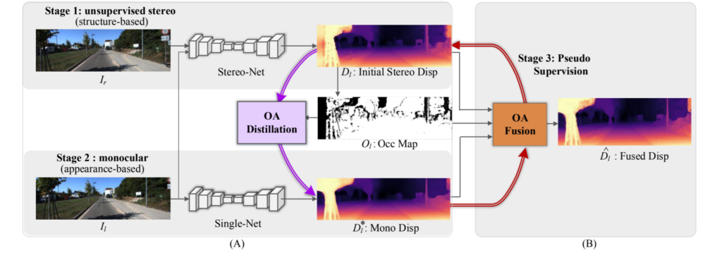 그림1. 전체 파이프라인. 학습 단계는 총 3단계로 구성되어있으며 첫번째 단계에서는 Stereo image를 이용한 기본적인 Self-supervised 학습 방식으로 Disparity를 추정. 2번째에서는 OA Distillation module을 통해 SingleNet을 supervised 방식으로 학습. 3번째 단계로 각 네트워크에서 나온 Depth와 Occ Map을 Fusion하여 탄생한 최종 Disparity map을 StereoNet에 Supervised 방식으로 학습.