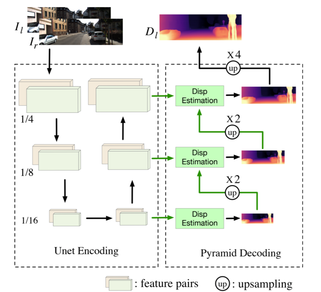 저자는 더 깊은 feature map이 higher-resolution disparity map을 생성하는데 있어 필수적으로 생각하였기에, pyramid encoding stage를 Unet 구조로 바꾸었다고 합니다. Pyramid encoding 구조가 Unet이랑 무슨 차이가있는지는 잘 모르겠네요..? 같은걸로 알고 있었는데 흠..
