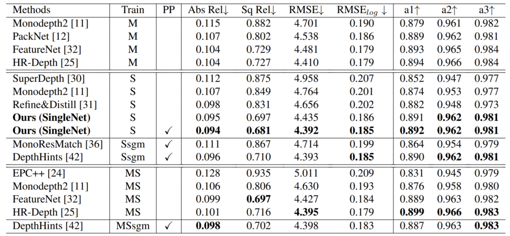 또한 해당 표에는 없지만 2020? 2021? CVPR에 나왔던 PLADE NET이라고 있는데 해당 방법론은 KITTI에서 Abs_Rel 0.092, Sq_Rel 0.626, Rmse_log 0.175로 저자가 제안하는 방법론보다 훨씬 더 좋은 결과를 보이고 있습니다. 그것도 입력 해상도 640×192임에도 불구하구요.