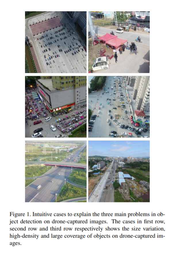 드론에서의 디텍션은 자율주행차량과 같은 ground에서의 디텍션과는 다릅니다. 위의 그림을 보시면 아시다시피 그 대표적인 차이가 바로 검출할 대상물체의 크기입니다. 그러므로 해당논문에서는 COCO데이터셋과 같은 인스턴스의 크기가 큰 경우에 최적화 되어있는 YOLO를 그대로 사용하지 않고 추가적인 수정을 많이 하였습니다. 제가 직접적으로 드론에서의 디텍션에 관심이 있다기보단, Small object를 찾기위해 취하는 테크니컬한 부분에서 영감을 얻을 수 있지 않을까 해서 읽게되었습니다.