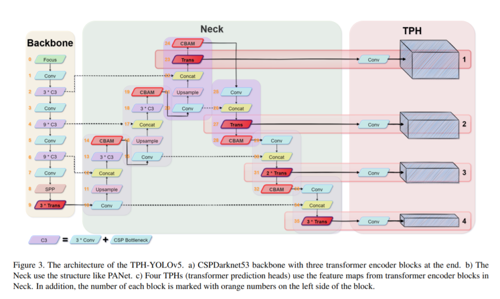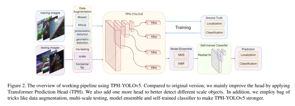 다른 디텍션 방법론들과 마찬가지로, 프레임워크는 피쳐를추출하는부분과 Backbone과 Neck, Head로 나뉘어져 있습니다. 위의 그림에서 Head는 TPH 에 해당하는 부분으로 기존의 Head와는 다르게 transformer를 사용하였기에 Transformer prediction heads라고 명칭하였습니다.
