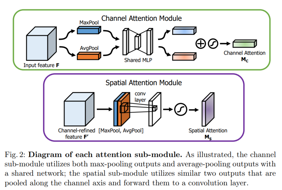 원리는 그리 복잡하지않고, MaxPool과 AvgPool한걸 element-wise로 더해준다음 MLP를 태워주고 나온 1d Vector를 나눠서 sigmoid를 태운다음 원래의 값에 곱해주는 방식입니다. 기존에 제가 리뷰했던 Attention Fusion for One-Stage Multispectral Pedestrian Detection에서 사용하는 attention 방식과 거의 동일합니다. 다만, 멀티스펙트럴인 경우에는 각 모달리티의 가중치를 구하는데 싱글모달리티인 경우에는 뭔가 background와 foreground에 대한 가중치의 느낌이 강한거 같네요.