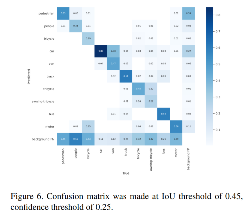 또한 인스턴스 크기가 너무작아서 디텍션 결과의 classification 이 poor하였고, 이를 개선하기위해 detection된 영역을 crop하고 64*64로 리사이즈하여 다시 classification하는 방식을 사용하였습니다. 그리고 이를통해 confusion matrix에서tricycle, awning-tricycle등 일부 물체에 대한 classification 성능이 올라간것을 확인했습니다.