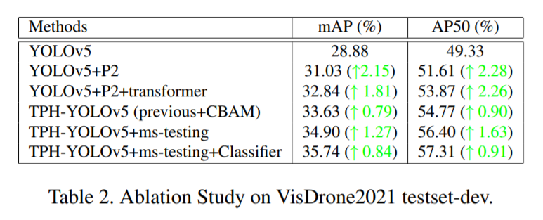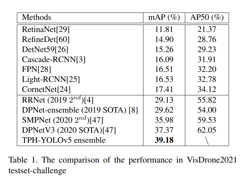 또한 위처럼 간단한 구조의 transformer를 CNN블록을 대신하여 사용하였습니다. 저자가 말하기를 “we believe that transformer encoder block can capture global information and abundant contextual information.” 라고 하였는데, 과연 진짜로 글로벌한 정보를 더 잘 인지할지 모르겠네요. 어찌됐든 CNN 블록 일부를 transformer로 대체하였을때, 더 좋은 성능이 나왔습니다. 그리고 특히나 드론 데이터셋의 특성상 instance끼리 오밀조밀하게 뭉쳐져 있거나 occluded된 경우가 많은데 이러한 환경에서 transformer 블록을 섞어주는게 성능개선 효과가 있었다고 합니다.