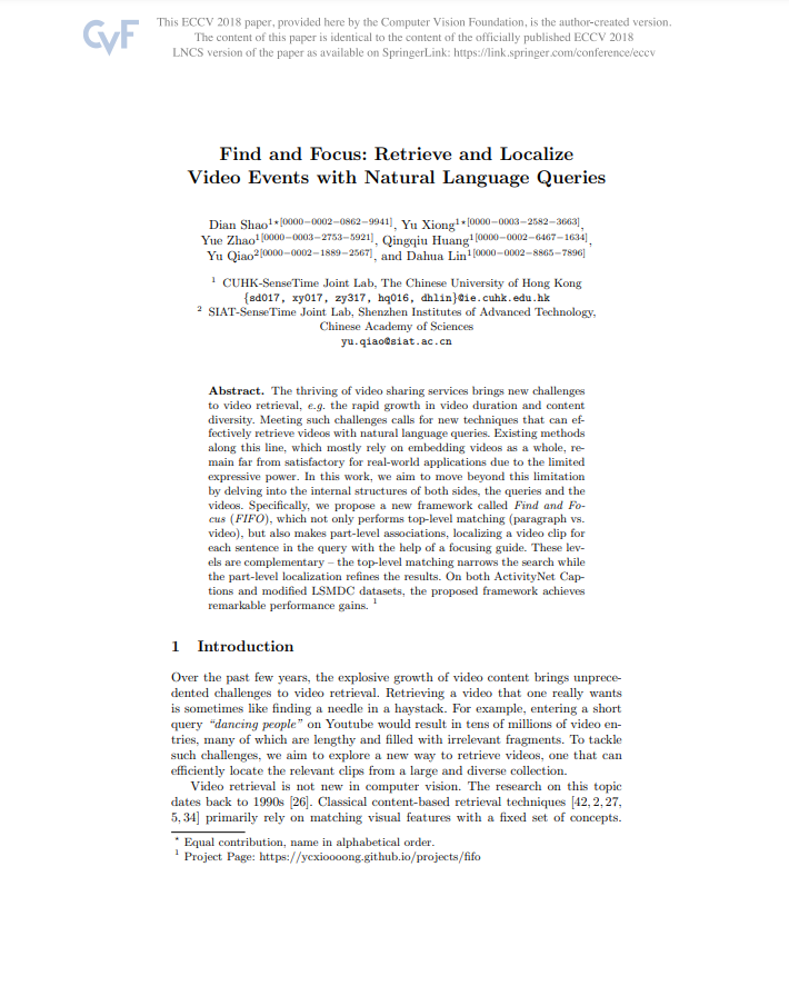이번에 리뷰할 논문은 ECCV 2018에 나온 Find and Focus라는 논문입니다. Paragraph-to-Video Retrieval에 대해 다루는 논문이지만 현재 준비 중인 저희 논문의 컨셉과 유사한 부분이 있어 리뷰를 하게 되었습니다. 이 논문 전 방법론들은 주로 비디오 전체를 embedding하여 사용하기에 제약된 표현럭을 지닌 단점이 존재했습니다. 본 논문은 이를 two stage로 나누어 top-level에서 matching하고 part-level에서 refinement를 진행하는 방식으로 해결하고자 했습니다. 자세하게 어떤 식으로 구성되었는지는 이후 파트에서 설명드리겠습니다.
