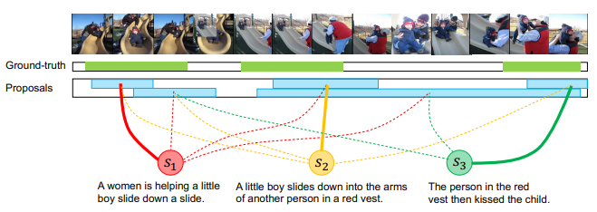 우선 Paragraph의 경우 문장 단위로 feature를 추출하고 Video의 경우 clip 단위로 feature를 추출하게 됩니다. Clip의 경우 TSN기반의 two-stream network를 사용하며 문장도 비슷한 방식으로 추출한다고 합니다.(Bag of Words weighted with tf-idf) 그리고 각각 추출한 두 데이터의 feature들은 서로 다른 도메인이기때문에 서로 비교가 가능하도록 같은 도메인으로 projection시켜 줍니다. 어떤 방식으로 projection 시키는 지에 대한 자세한 언급이 되어 있지 않으나 흔하게 하는 방식으로 fc layer를 쌓지 않았을까 싶습니다.