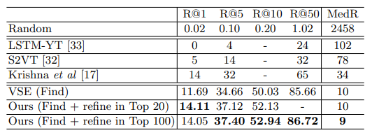 Table 1과 2는 각각 ActivityNet Captions 데이터 셋과 LSMDC 데이터 셋에서 제안된 Find and Focus framework의 성능을 나타냅니다. R@K는 전체 GT 수 대비 K rank안에 존재하는 GT 수를 의미하는 것으로 높을 수록 성능이 좋은 것을 의미하며, MedR은 전체 GT가 배치된 중간 rank의 위치를 나타내는 것으로 낮을 수록 성능이 좋은 것을 의미합니다. Find의 모델로 VSE라는 기존 제안된 모델이 사용되었는데 이 모델 만으로도 R@50의 성능이 높은 것을 보아 searching space를 줄이는데 도움을 준 것을 알 수 있으며 refinement까지 진행했을 때 Recall이 많이 올라간 것을 알 수 있습니다.