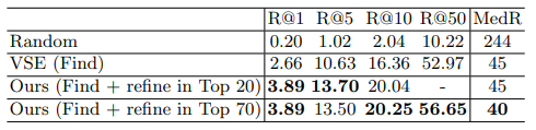 두 데이터를 각각 embedding 시켜 한 비디오 당 하나의 feature, 한 Paragraph 당 하나의 feature를 생성합니다. 이처럼 embedding 시킬 때 각각 positive pair와 negative pair를 생성하여 triplet margin loss로 학습을 시키게 됩니다. 이후 feature 간의 유사도를 계산하여 top-level의 relevance를 계산하고 한 Paragraph 별로 K개의 유사한 Video를 반환합니다. 저자는 실험적으로 K가 작음에도 높은 recall을 보였다고 합니다. Recall이 높을 수록 데이터 셋에 존재하는 GT가 K 내에 많이 포함되어 있음을 나타냅니다. 고로 작은 K에도 충분히 GT가 포함되어 있기에 searching space를 줄이는데 도움이 되었다고 볼 수 있습니다.