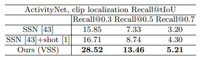 Table 3은 Clip localization 과정(VSS)에서 생성된 proposal에 대한 평가입니다. 2018년도에 제안된 논문이라 Temporal Action Proposal task에서 최근 유명한 여러 방법론들과는 비교하지 못한 듯 하나, Recall@tIoU 기준으로 가장 높은 성능을 보였습니다. Recall@tIoU는 GT segment와 proposal의 overlap이 tIoU 이상일 때 TP로 보고 Recall을 계산하는 방식 입니다.
