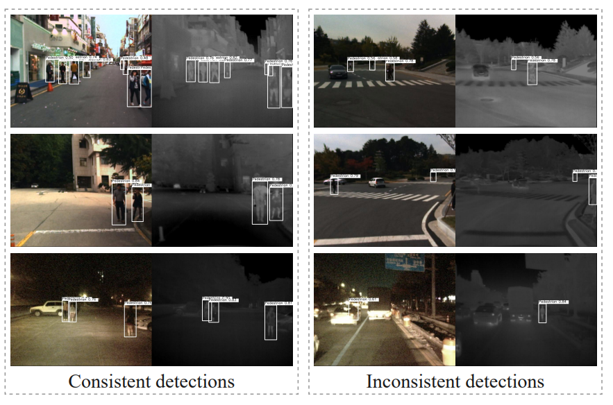 위의 그림은 단일 모달리티에서 학습한 detection 결과를 나타낸 그림입니다. 두 멀티스펙트럴 이미지의 detection 결과가 일치하는 ‘Consistent detections’가 있는 반면, 두 결과가 일치하지 않는 ‘Inconsistent detections’가 있습니다. 이러한 결과로 알 수 있는 사실은 두 모달리티가 ‘redundancy(중복)’하면서 동시에 ‘complementarity(상호보완적)’ 이기도 한 것을 의미합니다.