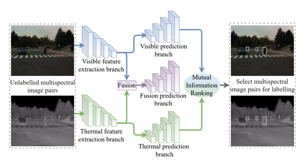 본 논문에서 사용되는 전체 아키텍처 입니다. 3가지 브랜치를 가지고 있으며, RGB와 Thermal 따로 예측하는 브랜치와 RGB-Thermal을 융합한 브랜치 입니다. 여기서 RGB와 Thermal을 따로 예측하는 브랜치의 결과를 통해서 Fusion 브랜치를 학습할 레이블을 선택하게 됩니다. 그리고 이러한 방법을 저자는 Active learning loop diagram과 유사하다고 이야기합니다.