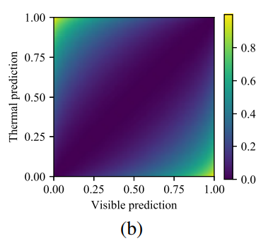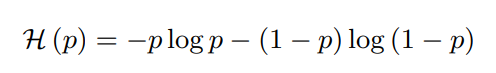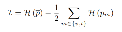 위의 수식에서 p는 각 prediction을 의미하며, v는 visible t는 thermal 을 의미합니다. 또 p바는 두 모달리티 prediction의 평균을 의미합니다. 또 H는 binary(2-set) entropy function을 의미하며 수식은 아래와 같습니다.