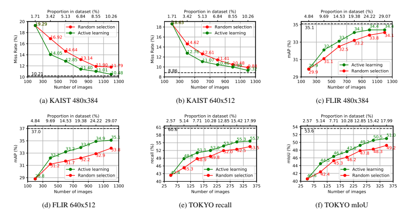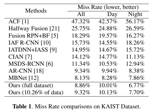 KAIST 데이터셋 평가결과에서 특징적인 부분은 전체 데이터셋을 사용하지 않아도 준수한 성능을 보인다는 점 입니다.