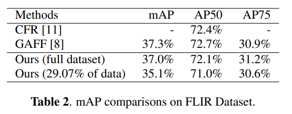 FLIR 셋에서 Misalignment가 크게 존재하는데, 해당 데이터셋에 대해서도 유의미한 성능을 나타내고 있습니다. (CFR과 GAFF는 모두 이 논문의 저자가 이전에 제안한 모델이며, 성능도 MLPD보다 우수합니다.)