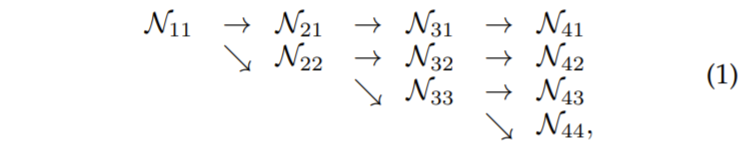 \mathcal{N_{ij}}에서 i와 j는 각각 stage와 scale level을 의미합니다. i값이 커질수록 네트워크의 뒷단을 향해간다는 것을 의미하며 j 값이 커질수록 Low Resolution을 가진다고 생각하시면 됩니다. 참고로 \mathcal{N_{11}}의 경우 해상도는 입력 이미지의 4배 다운 샘플링된 것이라고 보시면 됩니다.