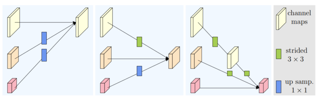 그림4의 제일 좌측의 경우 scale j가 1인 인 feature map이 target resolution 이므로 j=2,3인 feature map들이 up-sampling + 1×1 conv를 타고 나와 더해주게 됩니다. 우측의 경우에는 target resolution이 j=3인 feature map이므로, j=2인 feature map은 2배 down-sampling, j=1인 feature map은 2배 down sampling을 2번 연달아 진행해줍니다.