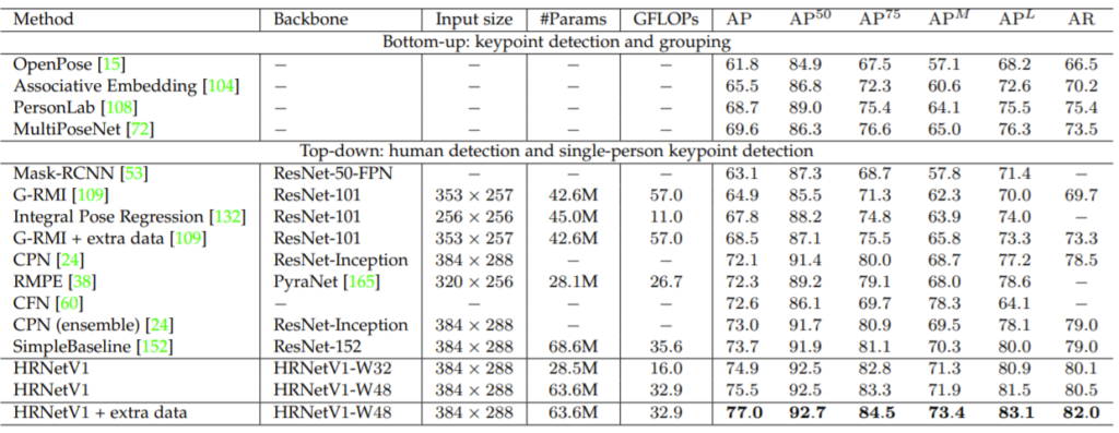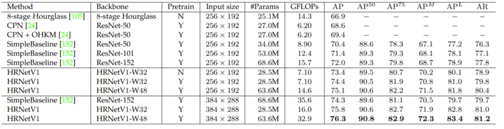 보시면 HRNet이 다른 방법론들과 비교하였을 때 학습 파라미터 수는 더 많긴하지만, 처리속도를 의미하는 GFLOPs에서 더 빠르며 성능 역시도 훨씬 좋은 것을 확인할 수 있습니다. 참고로 W48이 아닌 W32 모델의 경우 학습 파라미터와 속도가 2배 이상으로 빨라졌으면서 성능 역시 타 방법론보다 더 좋은 것을 확인할 수 있습니다.