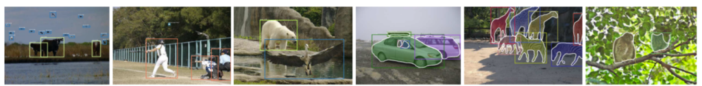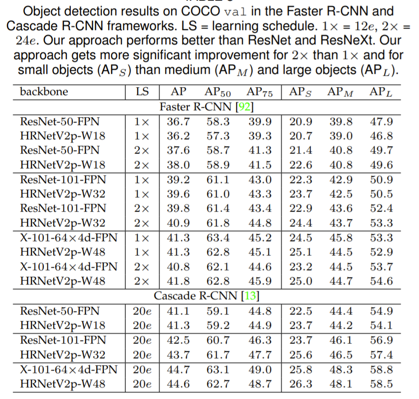 object detection에 사용한 데이터 셋 역시 MS COCO 2017 데이터 셋입니다. detection을 수행하기 위해서 그림5 (c)의 HRNetV2p를 사용했으며 정량적 결과는 다음과 같습니다.