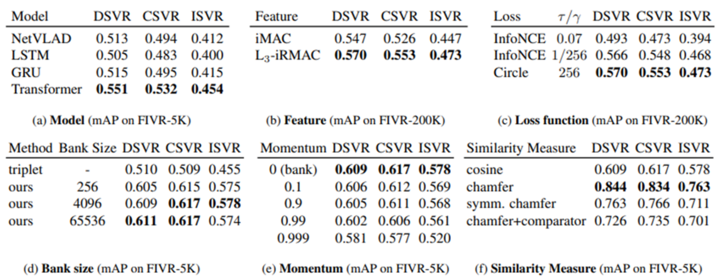 최종적으로 CC_WEB_VIDEO와 FIVR-200K에서의 실험 결과는 위와 같습니다. ViSiL과 성능이 비슷한 수준이긴 하지만, 기존의 Video-level방법론과 성능이 차이가 꽤 나는 점. 그리고 속도가 매우 빠르다는 점을 감안하면 놀라운 성능입니다.