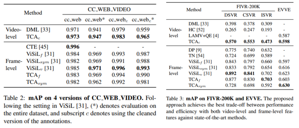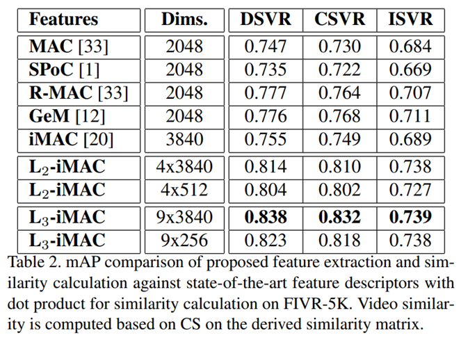 TCA에서는 feature extraction 방법론으로 iMAC과 수정된 L3-iMAC(여기서는 L3-iRMAC)을 사용합니다. 이 2가지를 선택하게 된 이유는 ViSiL의 실험 결과를 참고했다고 합니다. 위의 표가 ViSiL에서 실험한 각 방법론에 따른 성능 차이를 비교한 표입니다. 이 표를 보면 R-MAC과 L3-iMAC의 성능이 우수한 것을 확인할 수 있습니다. 하지만, L3-imac을 그대로 사용할 경우 당연히 compact하다고 말하기는 어렵기 때문에 기존의 R-MAC의 방법론을 따라 계층적으로 구성된 L3-iMAC의 output인 3×3 feature map을 더해 하나의 feature map으로 만들어서 사용합니다. 그리고 해당 방법론을 L3-iRMAC이라고 부르고 사용합니다. 이렇게 사용하는 이유는 spatial information의 보존과 낮은 차원에서 오는 compact 사이의 trade-off를 고려했다고 합니다. 최종적으로 이렇게 추출된 feature는 PCA와 L2 norm이 적용됩니다.