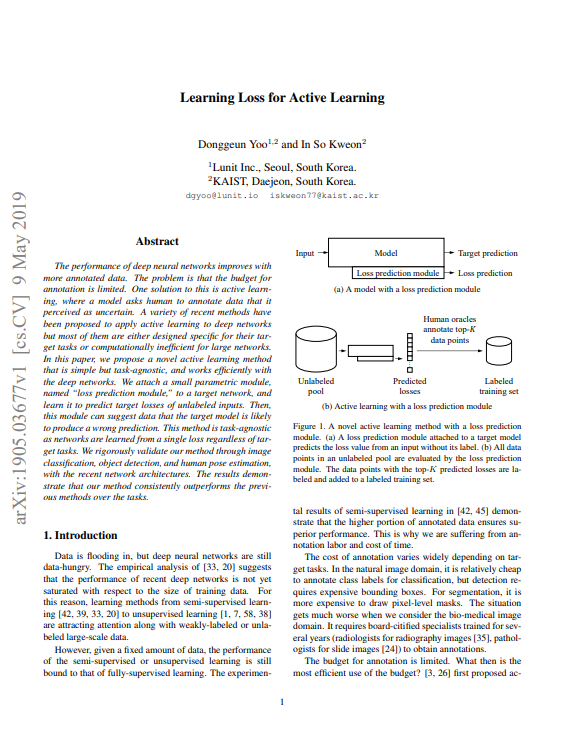 이번 리뷰할 논문은 다크데이터 과제에서 베이스가 되었던 논문입니다. 제목은 “Learning Loss for Active Learning”으로, 제목에서 알 수 있듯이 Active Learning를 다룬 논문입니다. 많은 연구실 분들이 Supervised Learning, Unsupervised Learning, Semi-supervised Learning, 그리고 Self-supervised Learning에 대해서는 잘 아시겠지만 Active Learning에 대해서는 생소하실 것 같아 해당 논문을 리뷰하게 되었습니다.