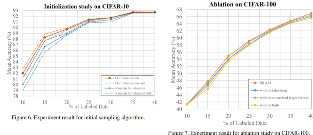 실험은 Image Classification( CIFAR-10, CIFAR-100, Caltech-101 ), Semantic Segmentation (Cityscapes) 에 대한 성능 평가와 3.3에 제안한 초기화방식과 relabeling, Unified representation에 대한 분석을 진행하였다. 실험 결과 기존 방법론인 VAAL, LL4AL, Core-set, MC-Dropout, Random 보다 모든 테스크와 모든 업데이트 사이클(Active Learing 과정 중 하나의 반복 과정)에서 좋은 성능을 보였다. 또한 초기화 역시 기존의 Random 초기화보다 효과적임을 <그림2>의 좌측 그래프에서 보였으며 <그림2>의 우측 그래프에서 제안한 방법론(relabeling, Unified representation)이 실제로 효과가 있음을 Ablation study로 보였다.