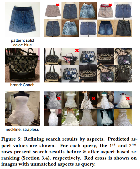 aspect re-ranking이 실제로 효과가 있는 예시는 위의 그림에서 확인할 수 있습니다. 위에서부터 색 정보, 브랜드 정보, neckline 정보를 바탕으로 re-ranking을 수행하면 전반적으로 유사한 결과를 얻을 수 있었습니다. deep feature가 놓치는 정보들을 aspect 정보들이 보완하여 정확한 검색 결과를 얻는 것입니다!