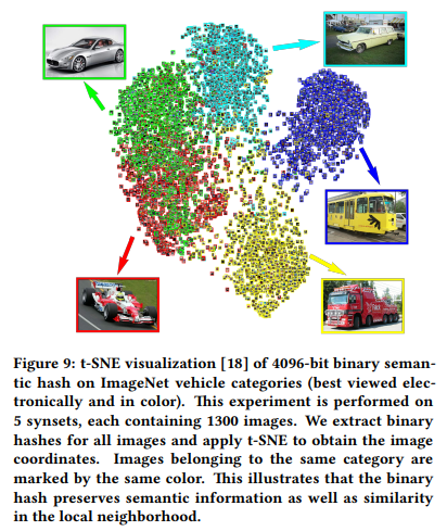 ImageNet에서의 시각화 결과는 위와 같습니다. 실제로 분류가 어느정도 되어있는 모습입니다. 이 시각화 결과는 binary hash가 semantic한 정보를 보존하고 있기 때문에, hash collision을 고려했을 때 이 정보들을 인코딩 하는 것이 중요하다고 하네요.