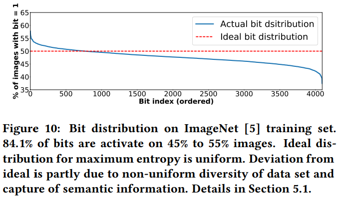 Binary hash function을 사용할때 중요한 것 중 하나가 Bit가 잘 분배되어 있어야 hash collision을 막고, 구분이 잘 된다는 것입니다. 이 논문의 결과는 위 그림에서 확인할 수 있는데요, 딱 50%에 일치하지는 않지만, 적당히 잘 분배된 모습을 볼 수 있습니다.