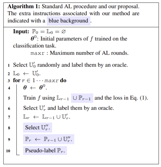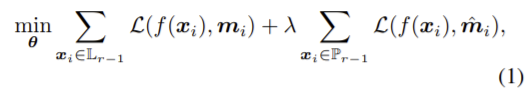 매 round 마다 pseudo-labeled sample과 queried를 함께 학습에 사용하고 다음 loss 함수를 이용하여 최적화합니다.