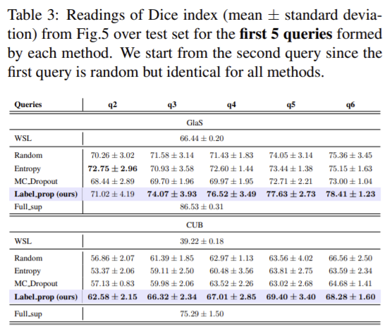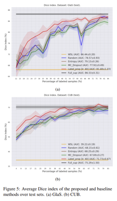 그림5 (a)는 GlaS의 Dice 정확도로 레이블을 더 추가하면 모든 AL 방법이 WSL 방식 보다 높은 성능을 보입니다. 표 3에서 확인할 수 있듯 class당 4개의 데이터만 무작위로 labeling 해주면 WSL을 능가하는 것을 확인할 수 있습니다.