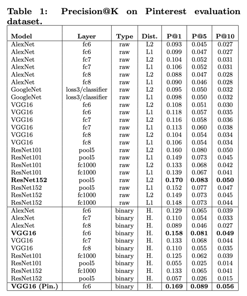 그럼 이 이미지들을 어떻게 분류하고 feature를 뽑는지 확인해봅시다. Pinterest에서는 당시 유명했던 모델들을 모두 사용했습니다. Alexnet, GoogleNet, VGG, ResNet을 사용했습니다. 그리고 Type을 보시면 raw와 binary가 있는데요, 역시 여기서도 binarized representation도 테스트합니다. 그리고 raw feature를 비교할때 L1을 쓸지 L2를 쓸지도 모두 테스트했습니다.