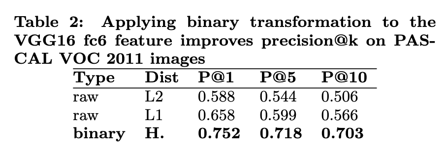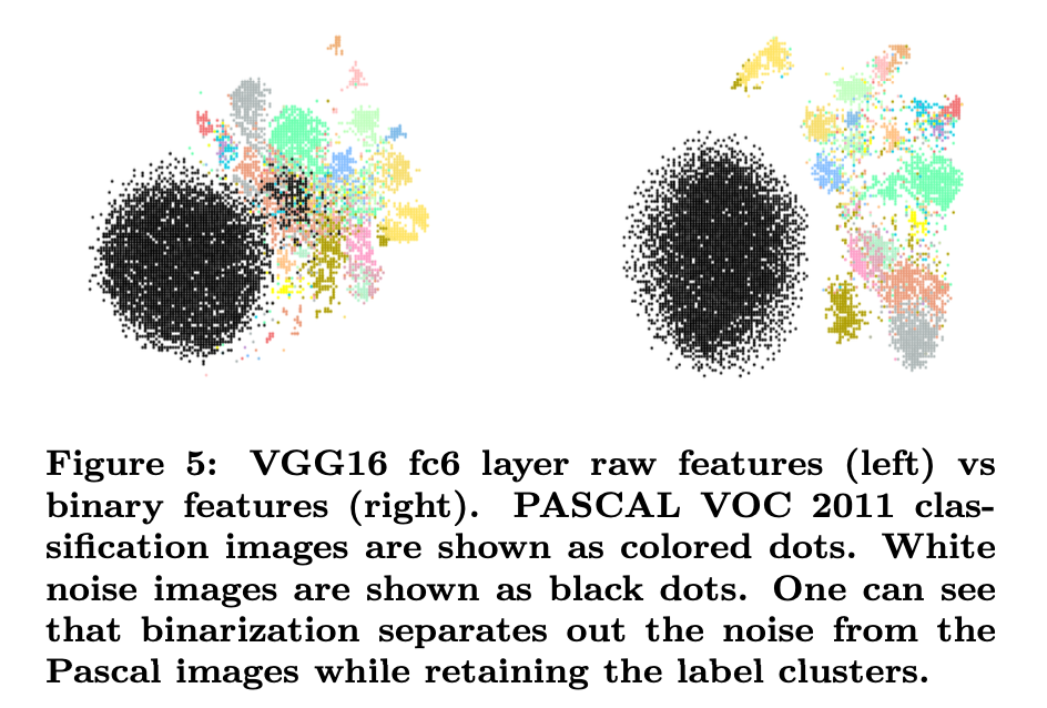 그리고 위 그림은 binarized representation의 효용성을 보이는 그림입니다. PASCAL VOC 2011데이터를 시각화한 데이터인데, 오른쪽(binarized)이 조금 더 잘 분리되는 경향을 보이는 것을 확인할 수 있습니다.