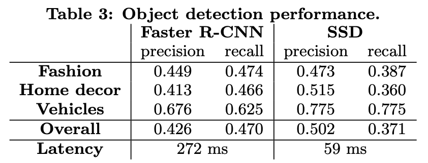 그런 이유로 해당 서비스에서의 노하우가 있었을지는 모르겠지만, Faster R-CNN과 SSD를 테스트 했습니다. 학습을 하는데 있어서 많은 내용이 있긴 하지만 결국 정리하면, SSD의 속도에 비해 Faster R-CNN의 성능이 그렇게 우수하지 못했기 때문에 실시간 서비스가 더 중요한 pinterest lens에서는 SSD를 사용하기로 결정했습니다. 나머지 서비스에서는 Faster R-CNN을 사용합니다.